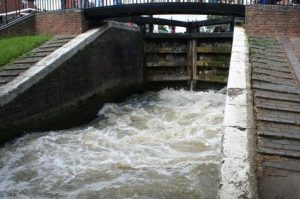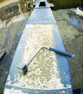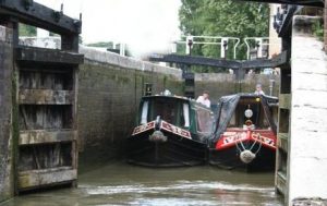 towards the lock. I strolled down to the top gate with the boys and saw that the lock was almost full and would not need much water let in before the gates would open. I put my windlass onto the gate paddle gear and showed Will and Justin how to set the ratchet so that it held up the rack and paddle as they were wound to open the water inlet and allow the lock to fill up. Once this was done, I pushed myself against one of the top gate balance beams and the gate began to open slowly. The boys cottoned on fast, ran over the footbridge to the other side of the lock and pushed against the other balance beam. Within a short time both gates were open and ready for the oncoming boat to steer into the lock chamber for its descent to the lower level of canal. Once the boat had entered the lock chamber the steerer called to us that there were in fact two boats and the other one was just behind them so they would wait until they arrived to ‘save water’ by going down the flight of locks together…